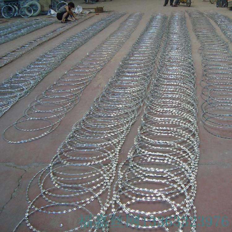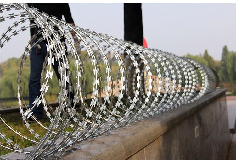 刺絲滾籠采用刀片刺繩繞圈后相臨兩圈每隔120°用刺絲連接卡固定,張開后形成蛇腹網(wǎng)狀,閉合后刀片刺繩圈徑為50cm,張開后每交叉圈