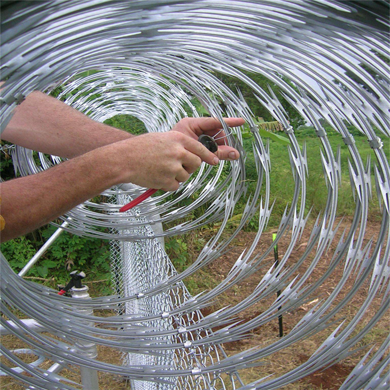 板做材料,由專用機(jī)械強(qiáng)力包附與熱鍍鋅高碳鋼絲或不銹鋼絲做的芯線上。由于有著鋒利美觀的刀片刺、高強(qiáng)度的芯線,使本產(chǎn)品綜合了防