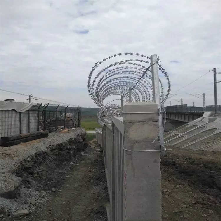 3、裝置好支持立柱后,在第一根立柱上裝置鐵絲,然后用鐵絲將刀刺網(wǎng)銜接到一起,并將刀刺網(wǎng)和鐵絲一起固定;