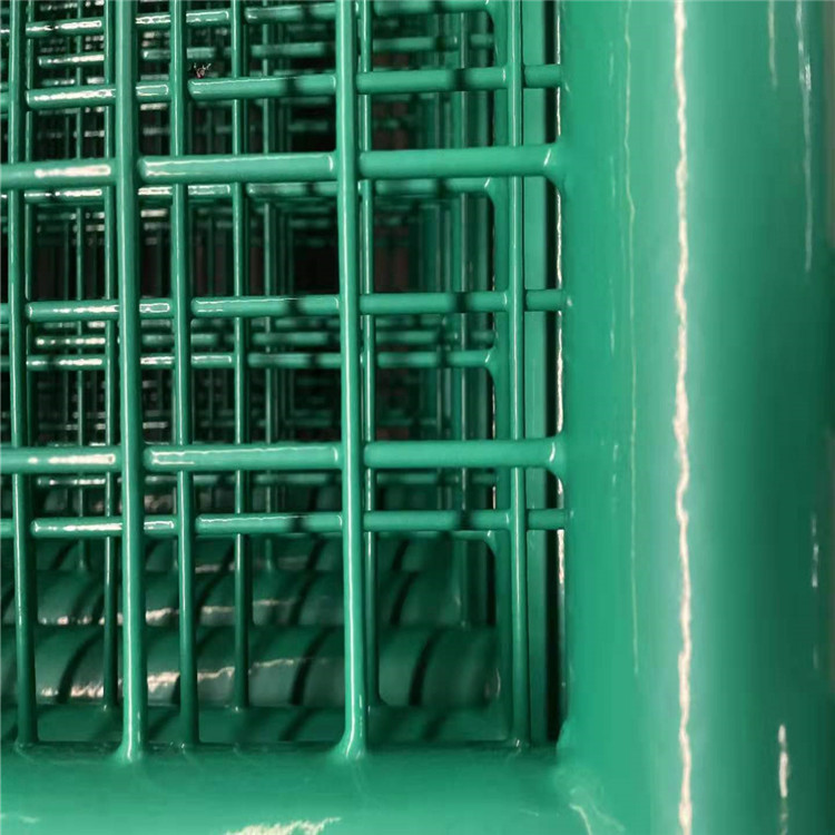 金屬網片及柵欄門的網片成形后應整體鍍鋅并進行熱浸塑(或噴塑)處理,浸塑厚度0.8mm~1.2mm,顏色選用墨綠色。涂層應均勻,顏色一致,表面光滑,無流柱,滴瘤、粉泡、漏鐵等缺陷。