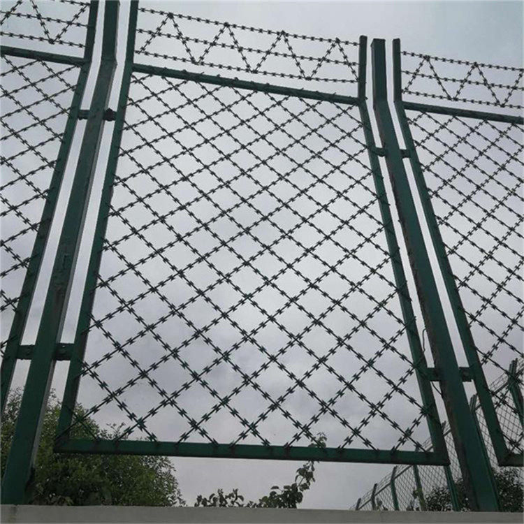 5. 監(jiān)獄鋼網(wǎng)墻頂部防攀爬刀片滾網(wǎng)、拉絲、卡扣,均采用不銹鋼材質(zhì)。刀刺網(wǎng)安裝固定卡扣整體調(diào)正,使刀刺網(wǎng)不出現(xiàn)擰轉(zhuǎn)情況,刀刺刺圈分布均勻,每隔30-40cm與拉絲固定;段連接處需將兩端刀刺網(wǎng)做連接固定,刀刺網(wǎng)固定點需緊鎖不得出現(xiàn)松動、脫落現(xiàn)象;刀刺網(wǎng)安裝與隔離網(wǎng)平行,上下左右均成直線延伸,轉(zhuǎn)角處需做加密加固處理。