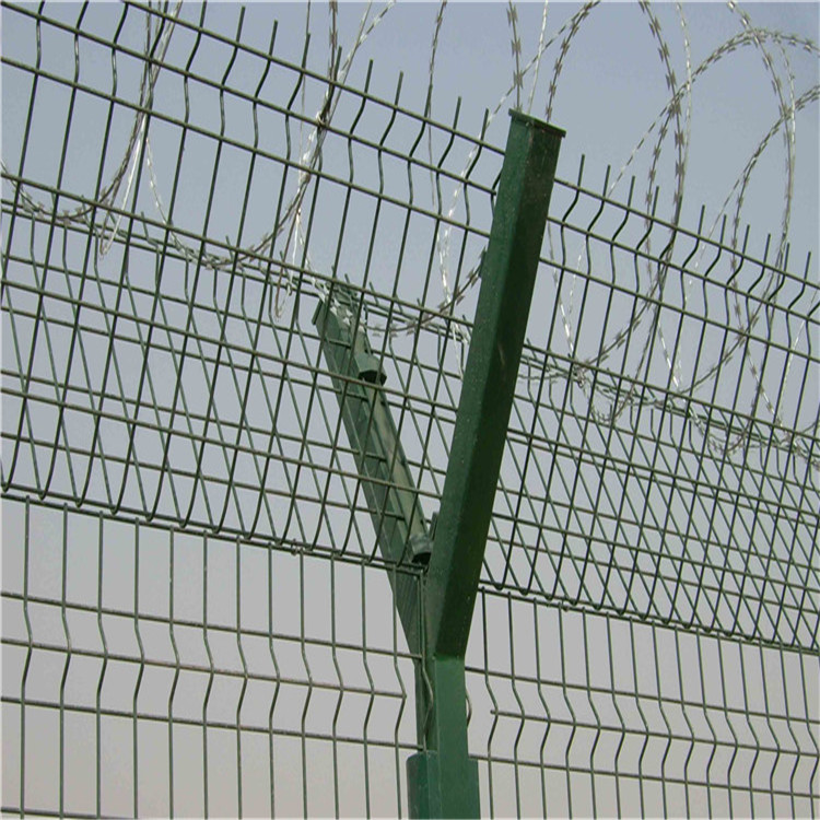 現(xiàn)在人們選擇飛機(jī)出行的方式越來越多,當(dāng)看到這種高大護(hù)欄網(wǎng)時(shí)不知是如何生產(chǎn)的,這種護(hù)欄網(wǎng)是采用大直徑高強(qiáng)度合金鋼絲制作。機(jī)場(chǎng)護(hù)欄網(wǎng)主要是采用高強(qiáng)度的刀片刺網(wǎng)與普通防護(hù)網(wǎng)的結(jié)合,由V型支架立拄,加強(qiáng)型焊接片網(wǎng),安全防盜連接件組成。
