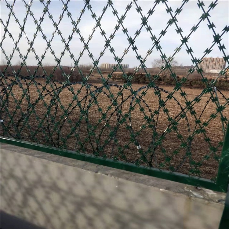 網(wǎng)片外表處理: 鍍鋅,噴塑,噴漆,電泳等?;蛘哂貌讳P鋼304,316等材質(zhì)刀片刺繩焊接,進(jìn)而拋光即可。不銹鋼材質(zhì)的刀片刺網(wǎng)使用壽命都可達(dá)到十年以上。