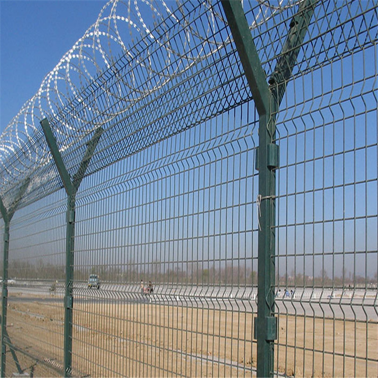 機場網(wǎng)圍欄規(guī)格最常見的是:鋼筋網(wǎng)片一般為墨綠色,外形尺寸2*3m,網(wǎng)孔5*50cm,絲徑5mm,上端有V型支架用來固定刀刺滾籠,加強二次防護(hù)功能。機場護(hù)欄網(wǎng)立柱采用80*60*6mm矩形鋼管,預(yù)埋0.5m左右,整體進(jìn)行熱鍍鋅和熱浸塑處理,防腐功能強、使用壽命長,是使用量最廣泛的機場圍界樣式。
