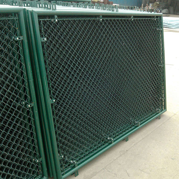 球場圍網(wǎng)由圍網(wǎng)框架+整體式拉網(wǎng)模式,結(jié)構(gòu)簡單耐用,整體效果好,性價(jià)比高。圍網(wǎng)的骨架通過直通、三通、四通等專用扣件將立柱和橫梁連成整體呈”口”或”日”字型,用高強(qiáng)度螺栓固定,圍網(wǎng)高度為4000mm,兩立柱間距三米左右;待圍網(wǎng)骨架搭建成型后,現(xiàn)場整體張拉圍網(wǎng),并用扁鐵固定在骨架的立柱及橫梁上?!九鋫?個(gè)1200mm*2000mm的單開式框架門】