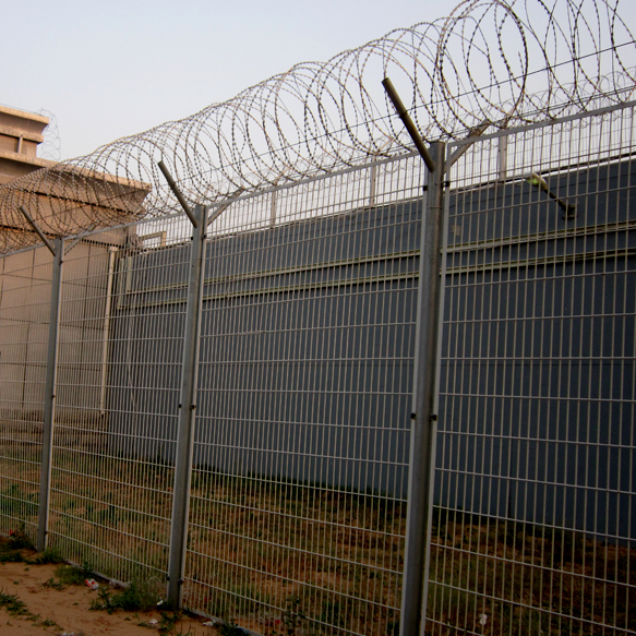 警戒金屬圍墻隔離網(wǎng)又稱作“Y型安全防御護網(wǎng)”,是由V型支架立柱,加強型焊接片網(wǎng),安全防盜連接件和熱鍍鋅刀片刺籠組成,在強度或安全防御性上的級別都很高。近年來,被廣泛應(yīng)用在監(jiān)獄,軍事基地等高安全場所。